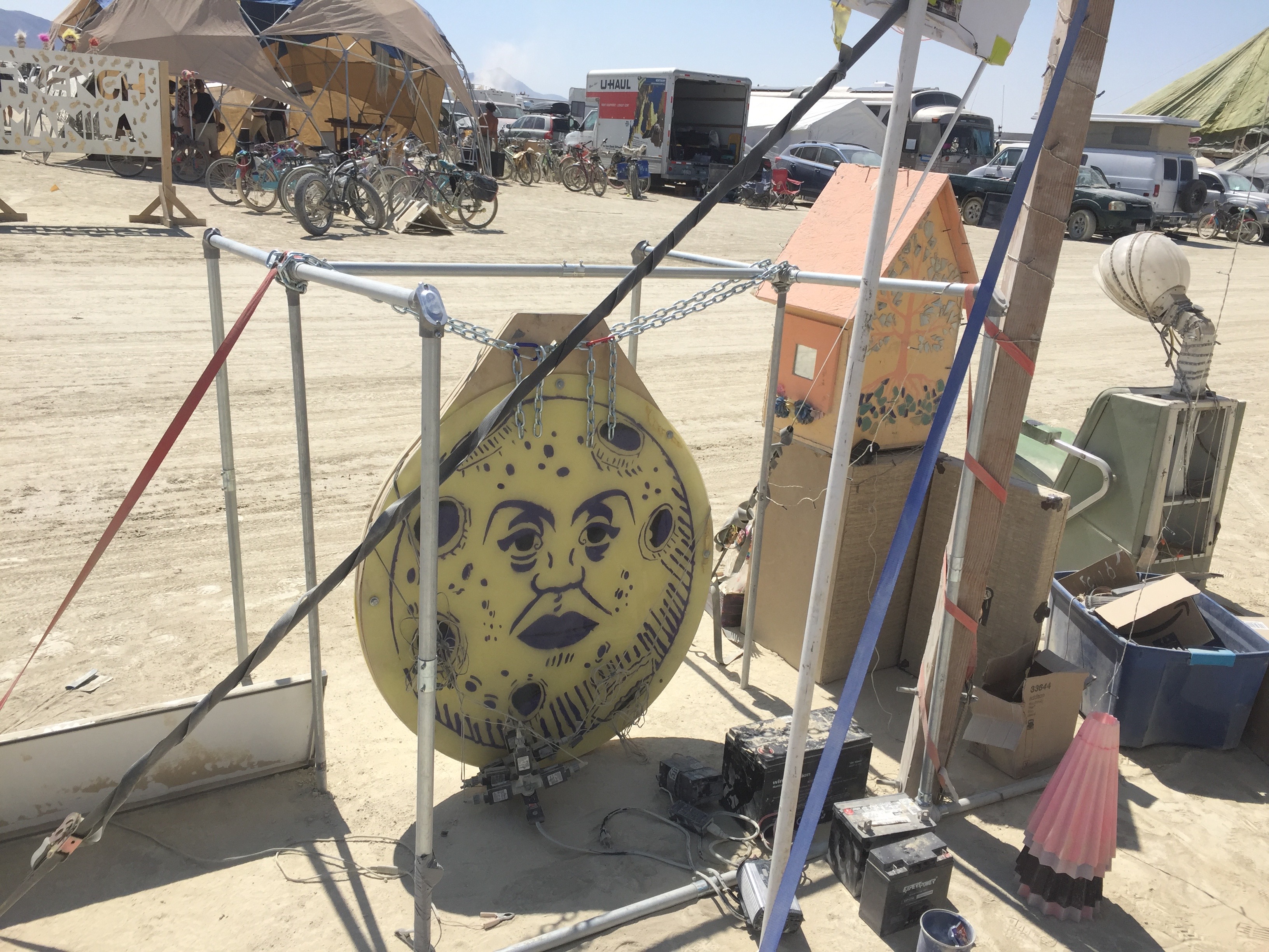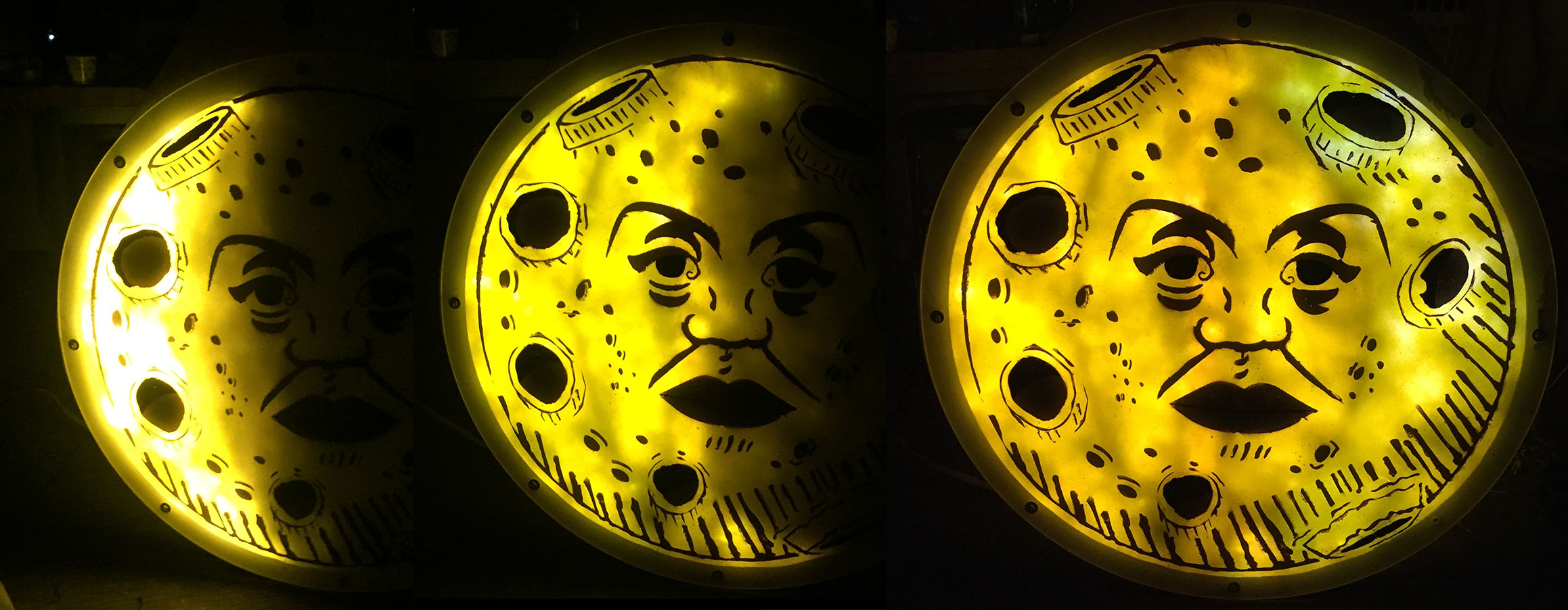 The moon has had a powerful relationship to humanity since we were taking shelter in caves. This massive LED moon changes once a day, growing fuller and then contracting marking the passage of time. The face is from Le Voyage Dans la Lun (A Trip to the Moon) by Georges Méliès, made in 1902. The film was both a milestone for moving film, and a celebration of humanity daring to venture out into the unknown.